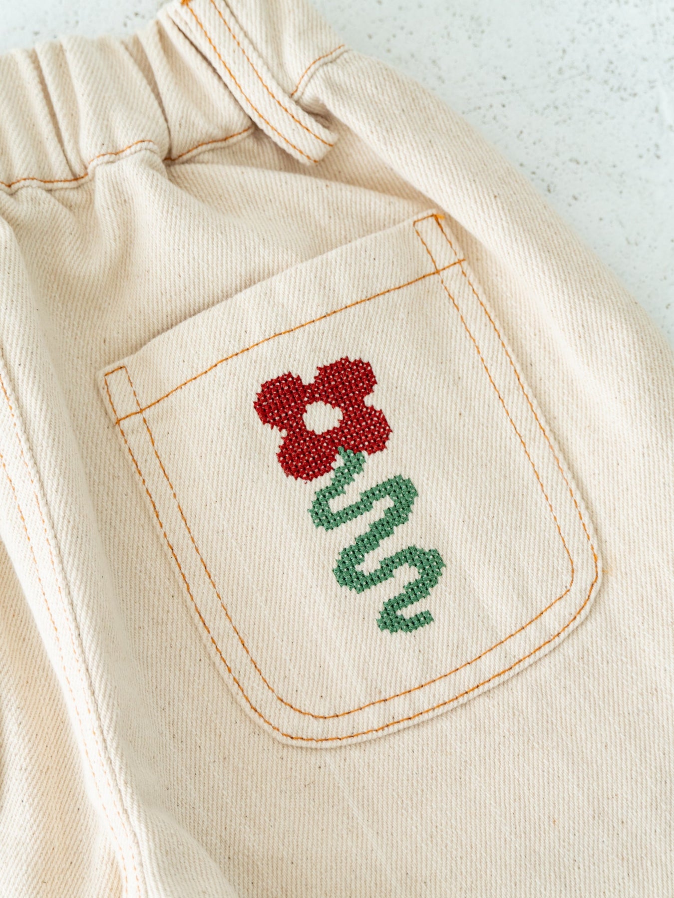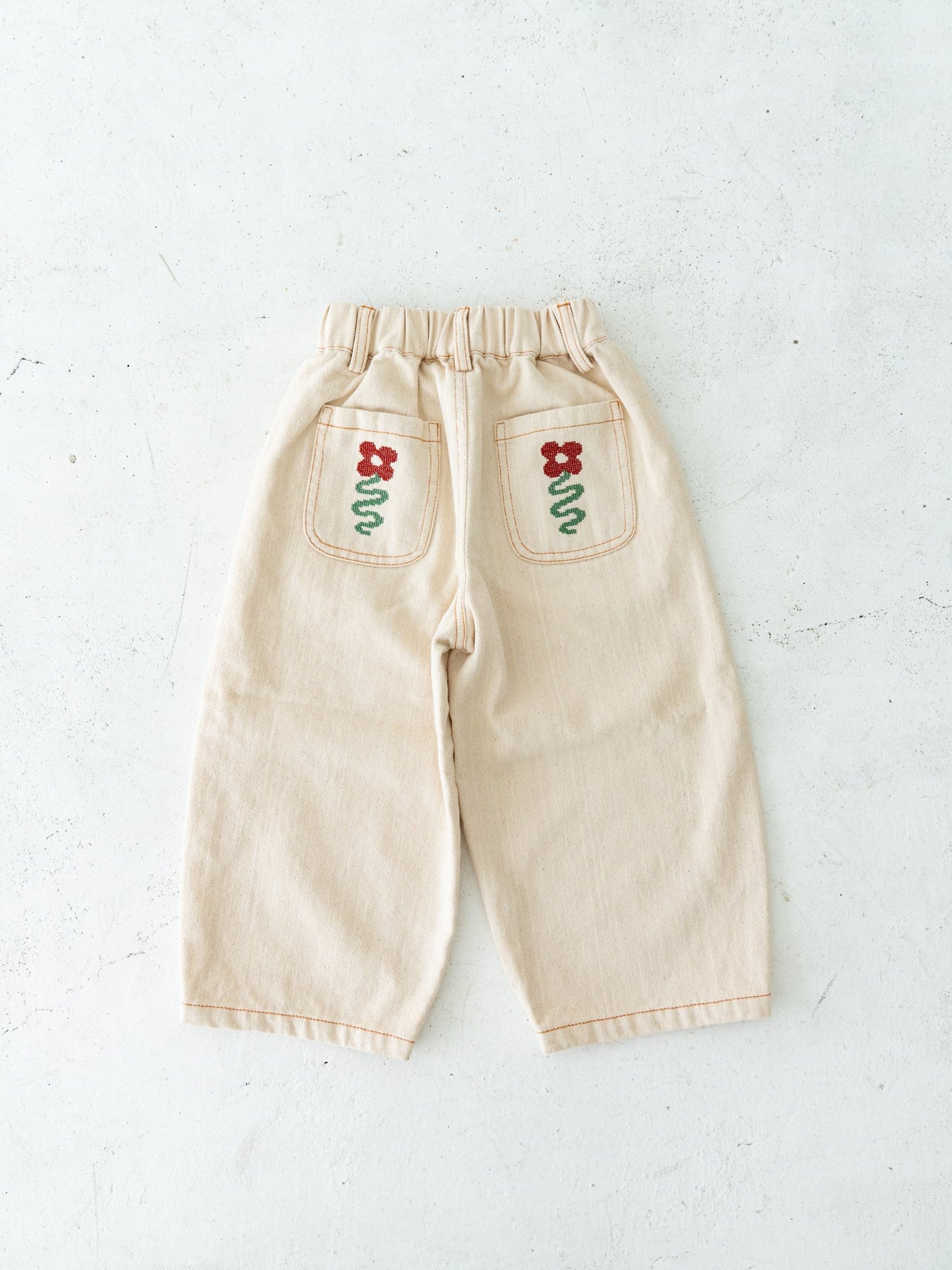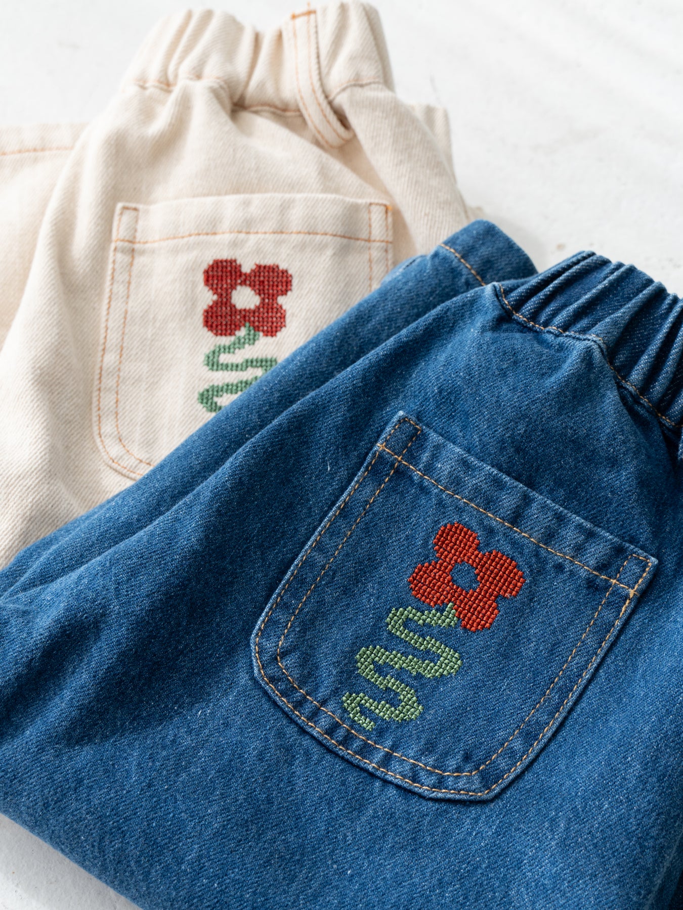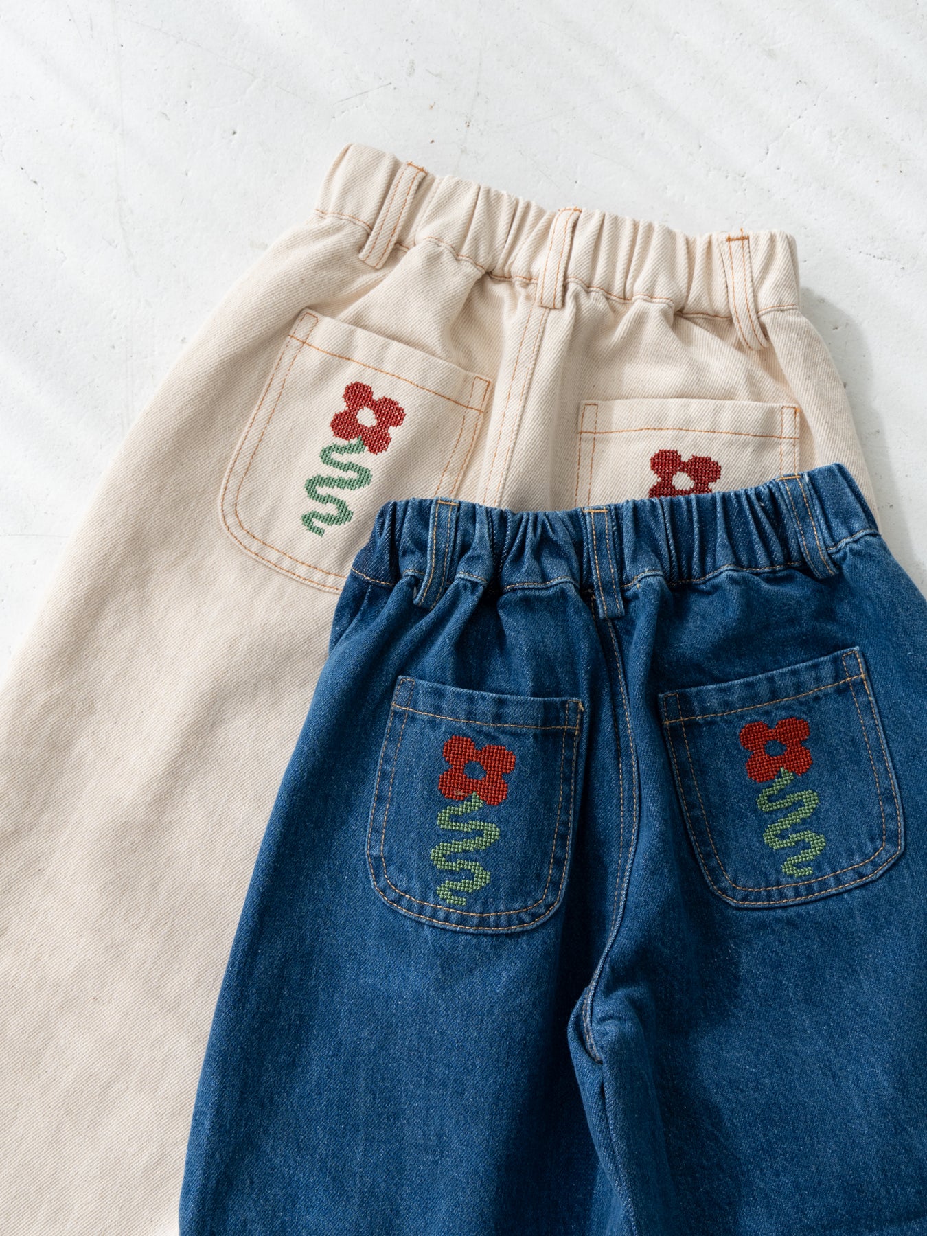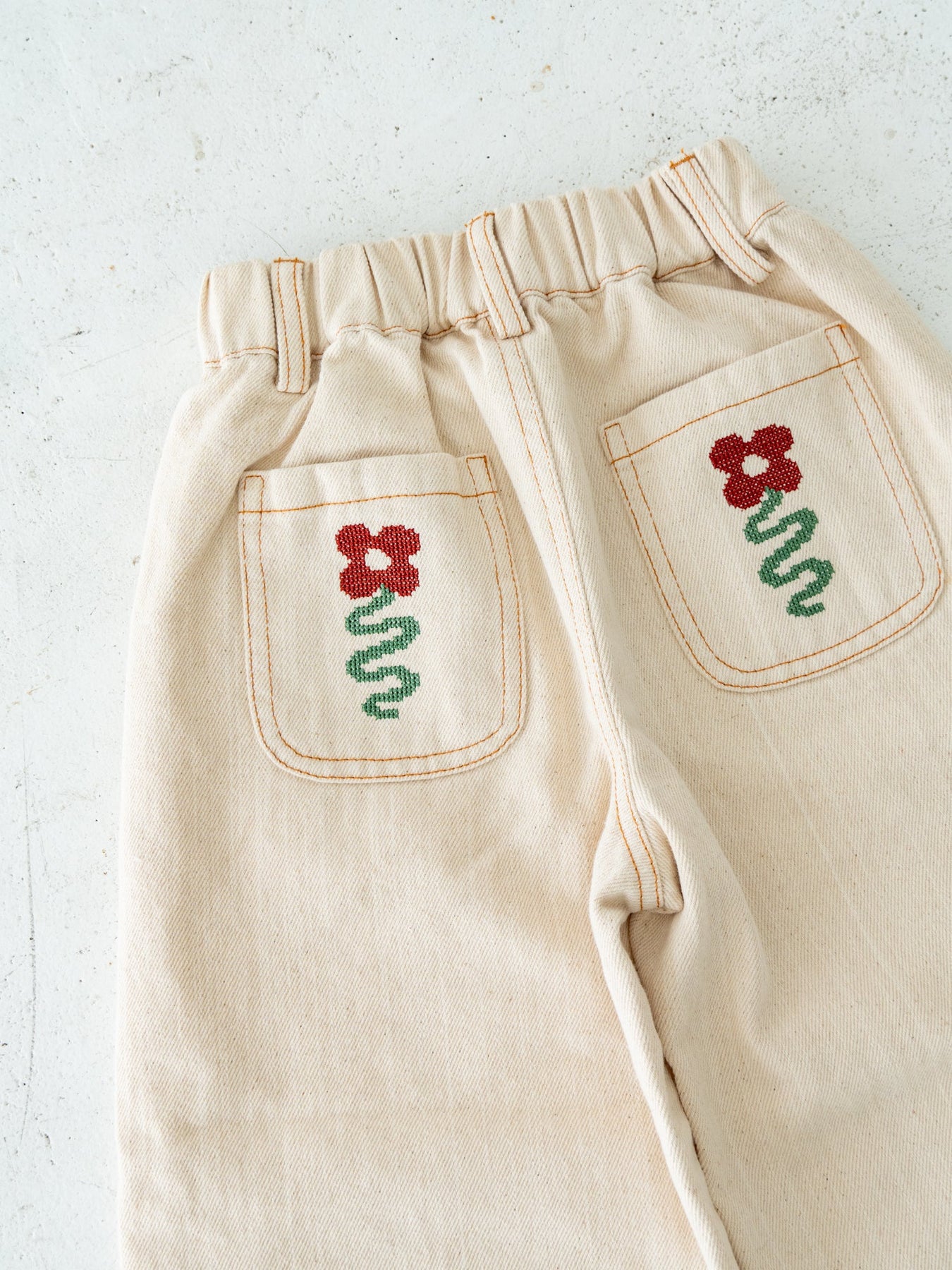 後ろポケットにちょこんと咲いた、クロスステッチのお花がポイント。
