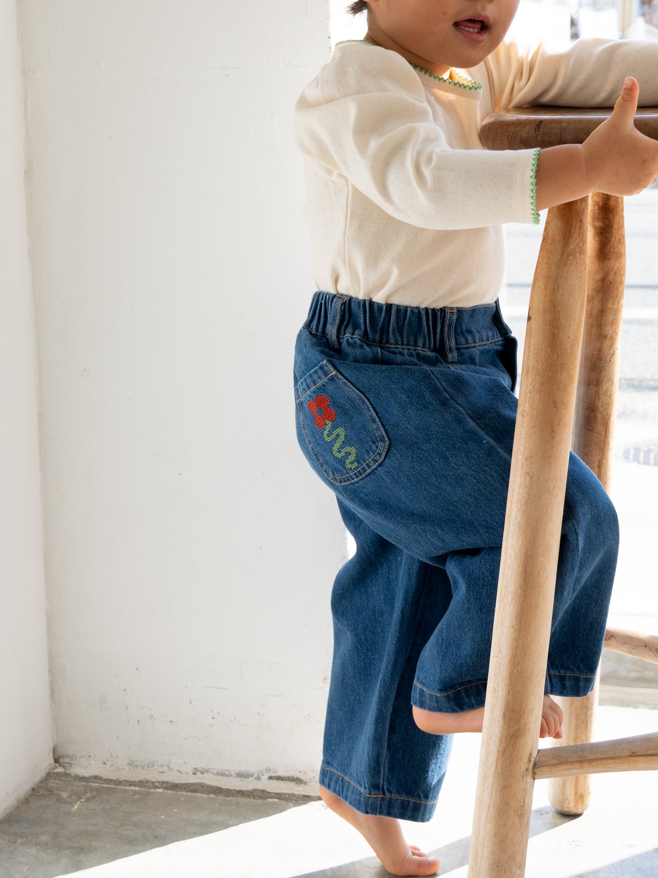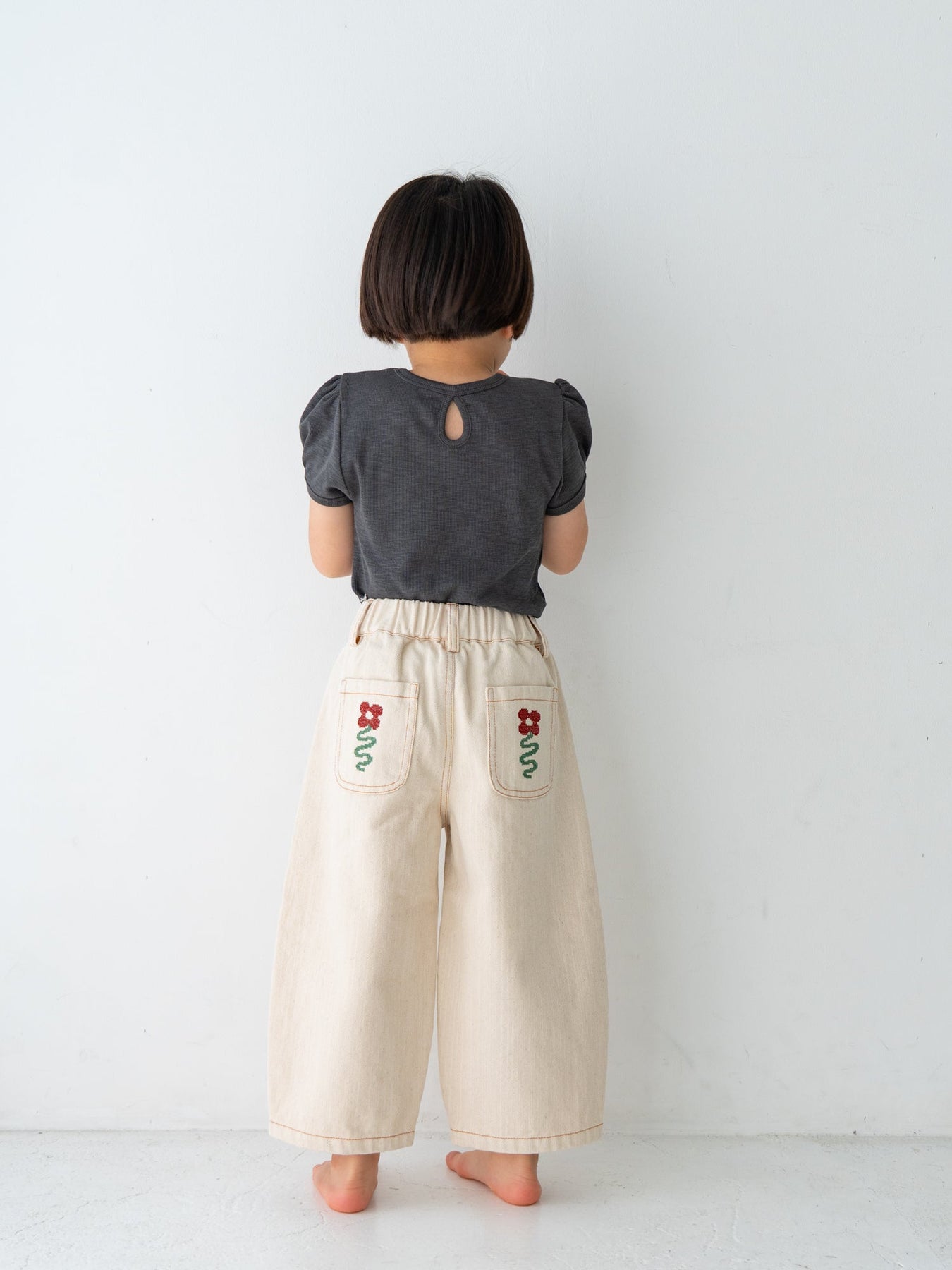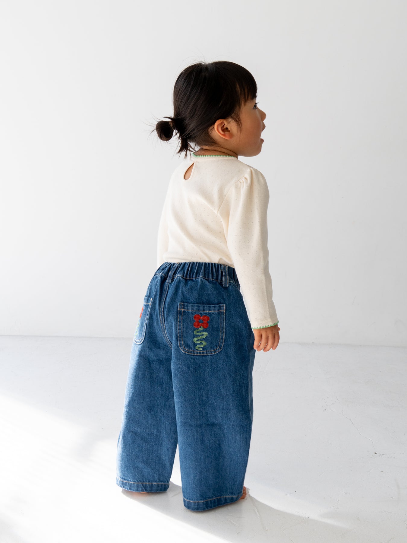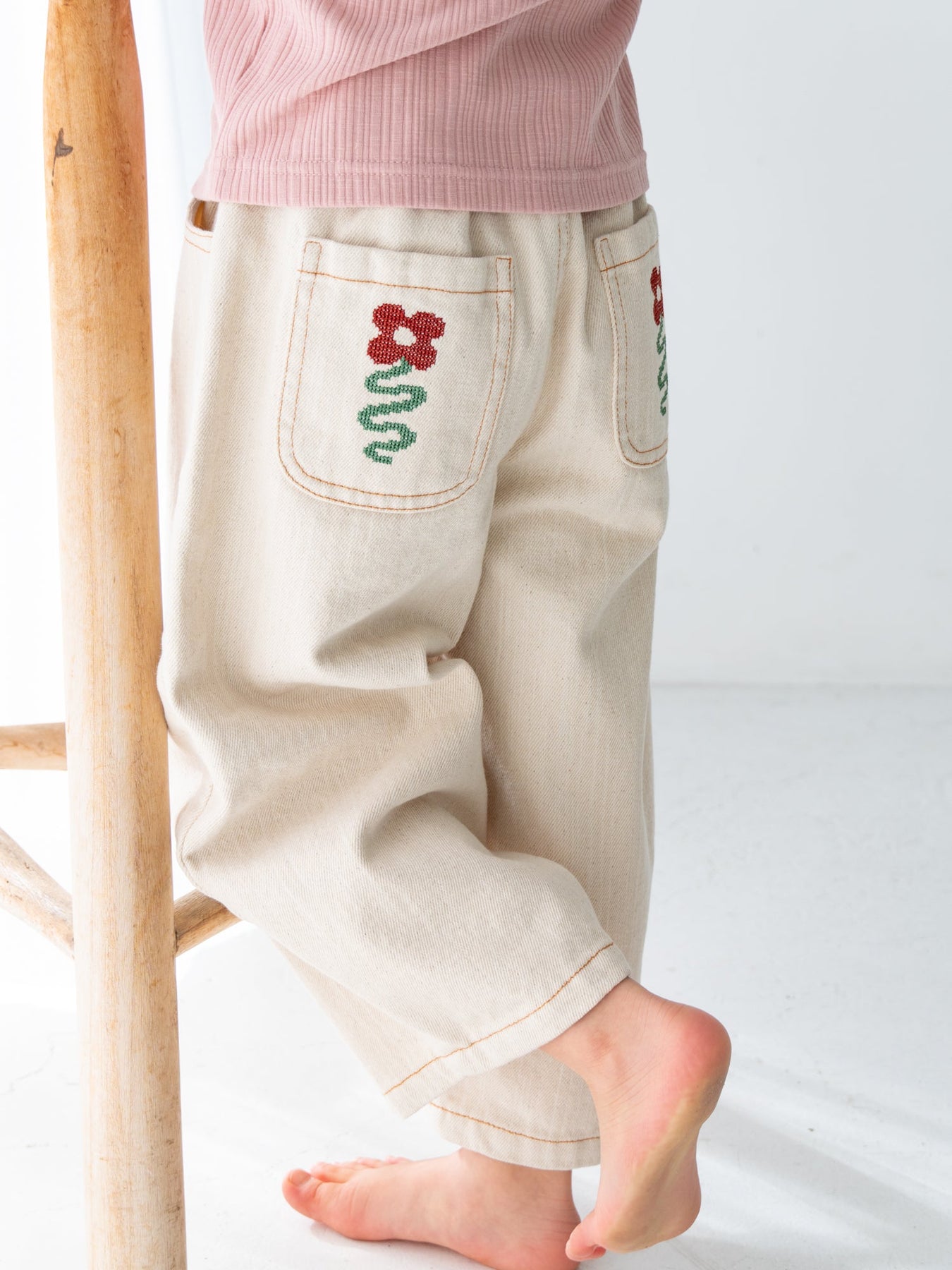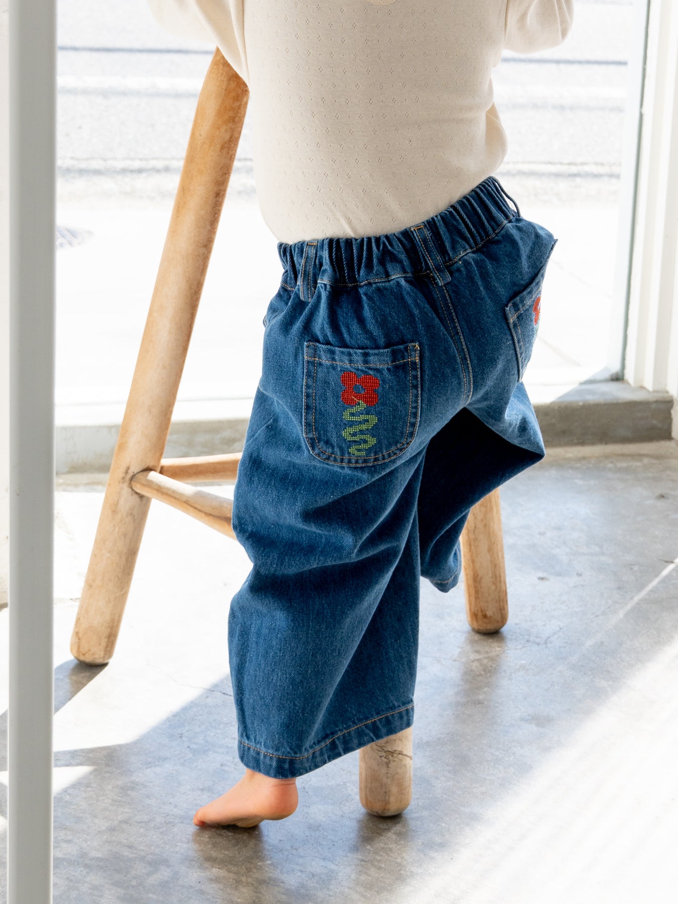 後ろポケットにちょこんと咲いた、クロスステッチのお花がポイント。