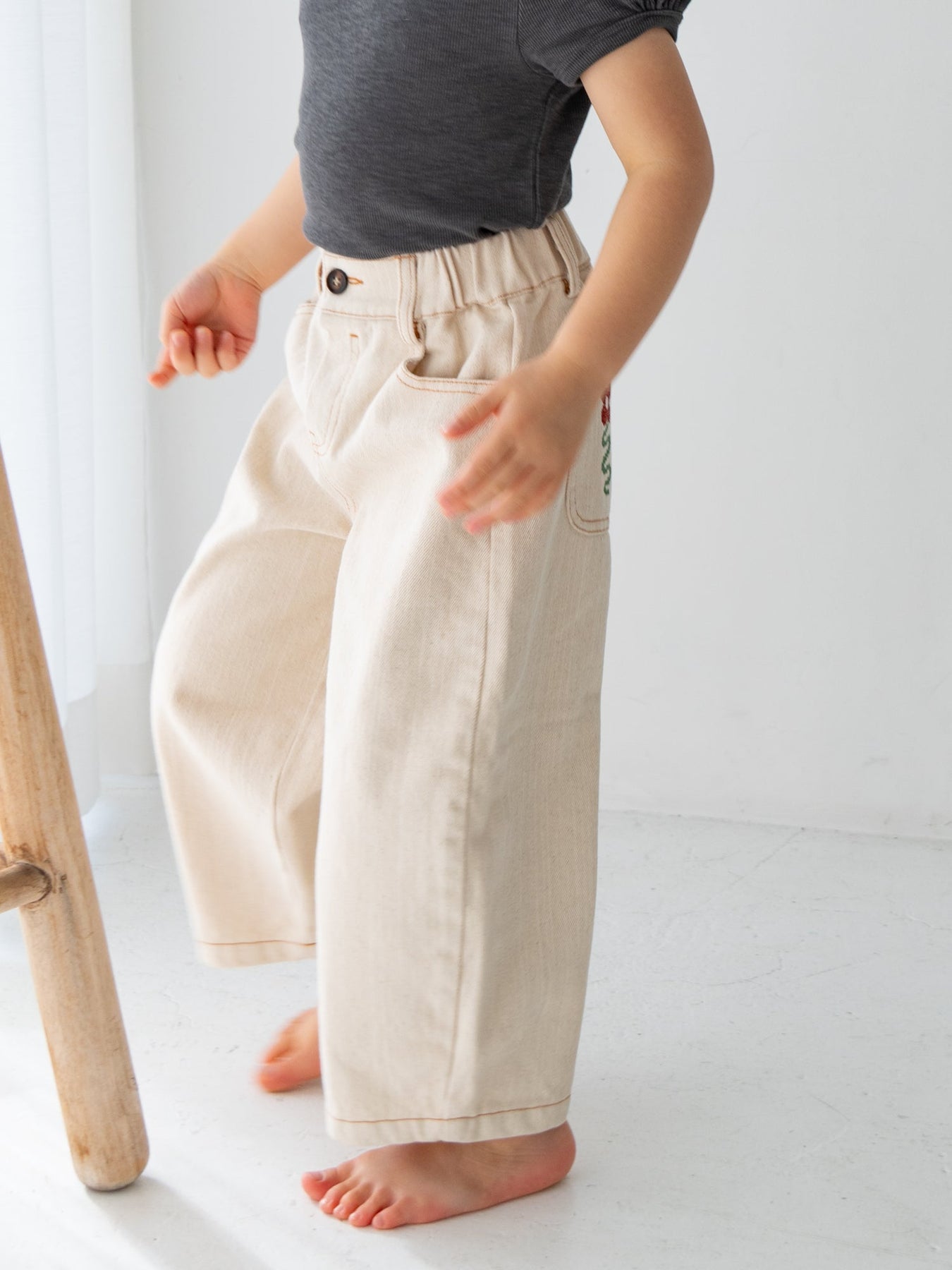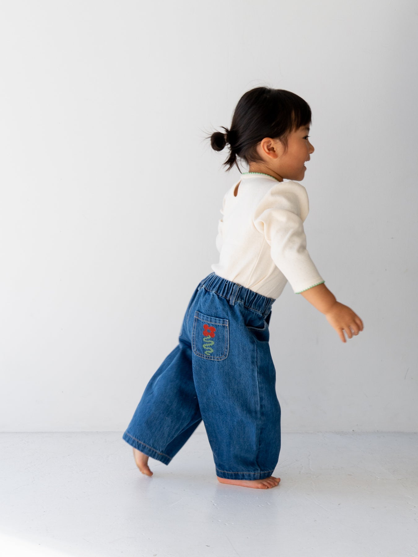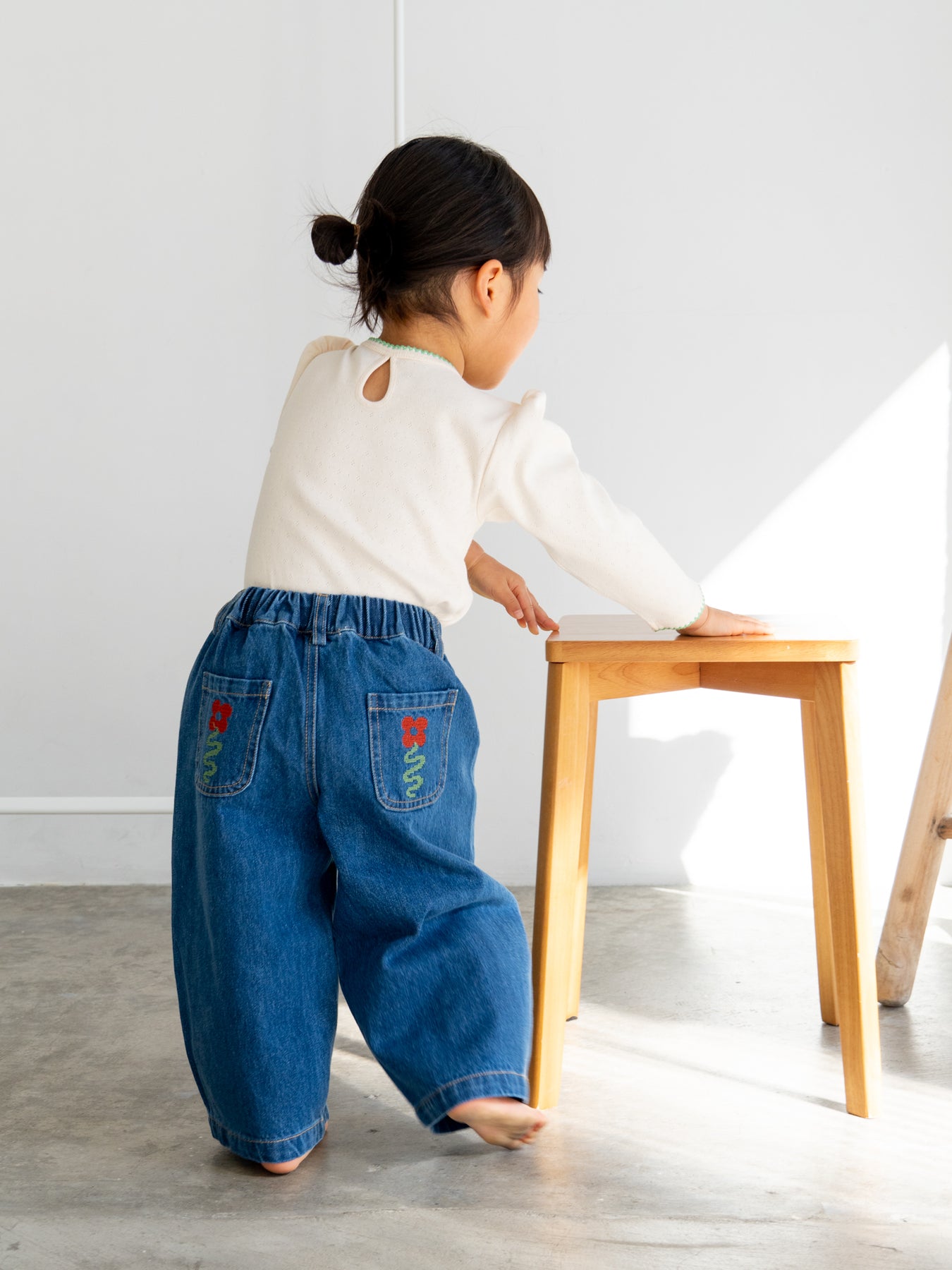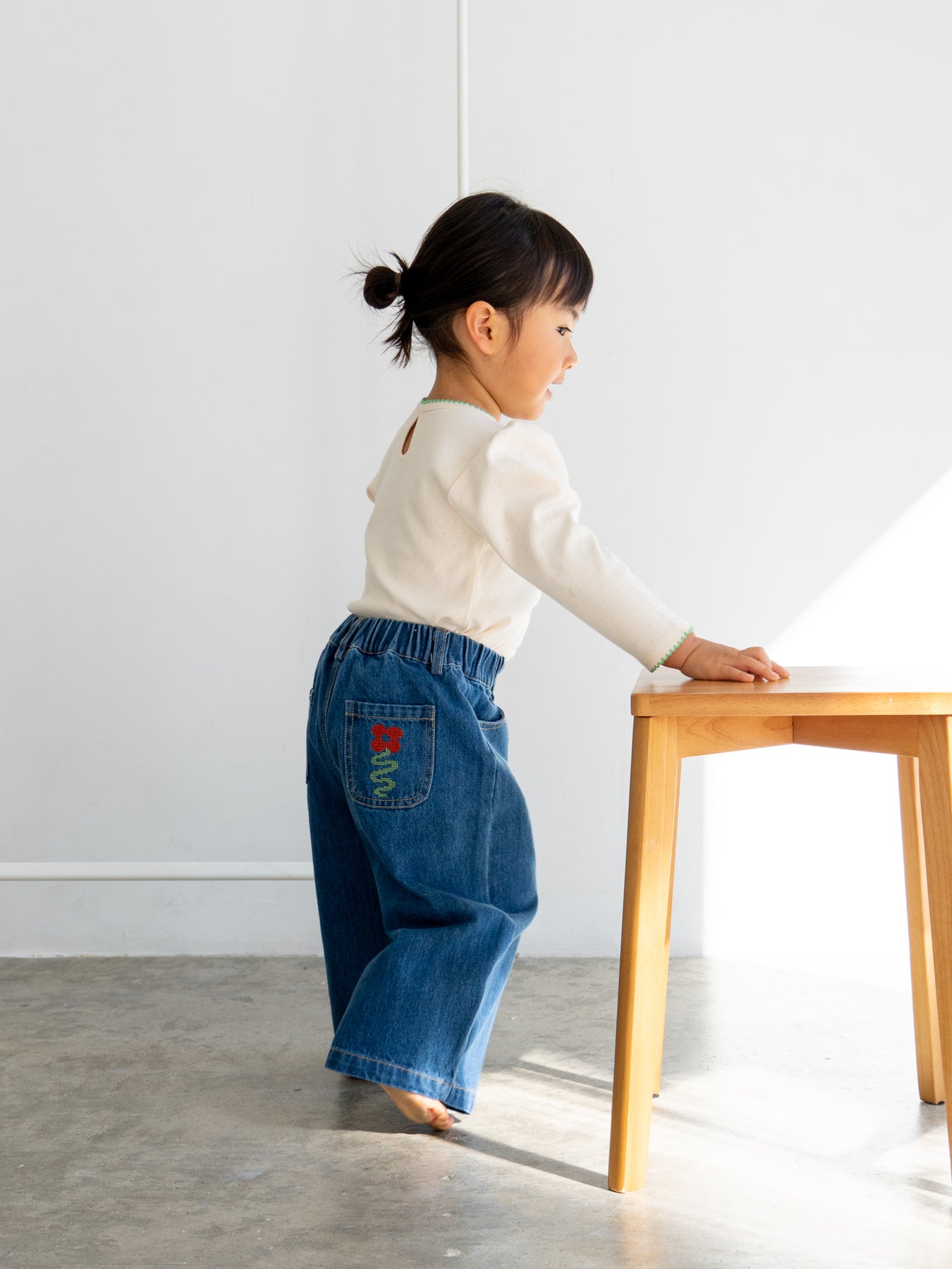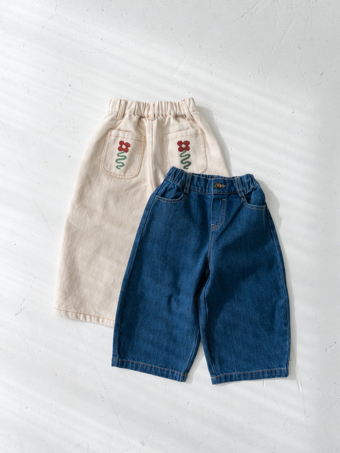 後ろポケットにちょこんと咲いた、クロスステッチのお花がポイント。