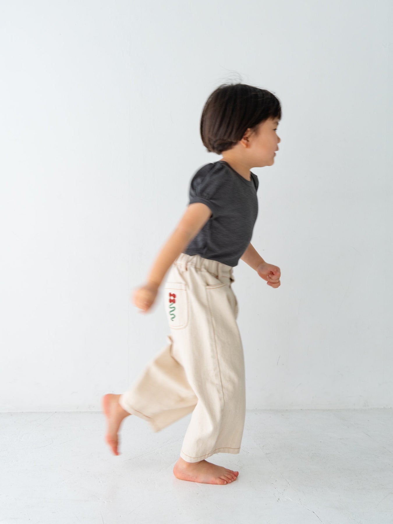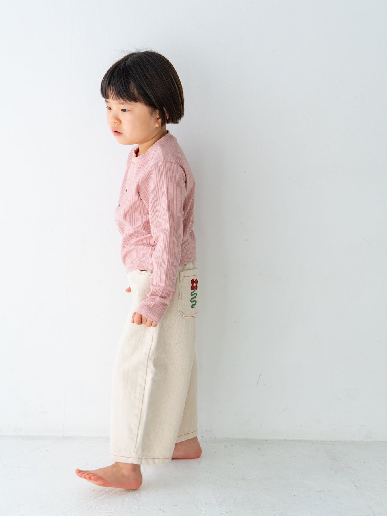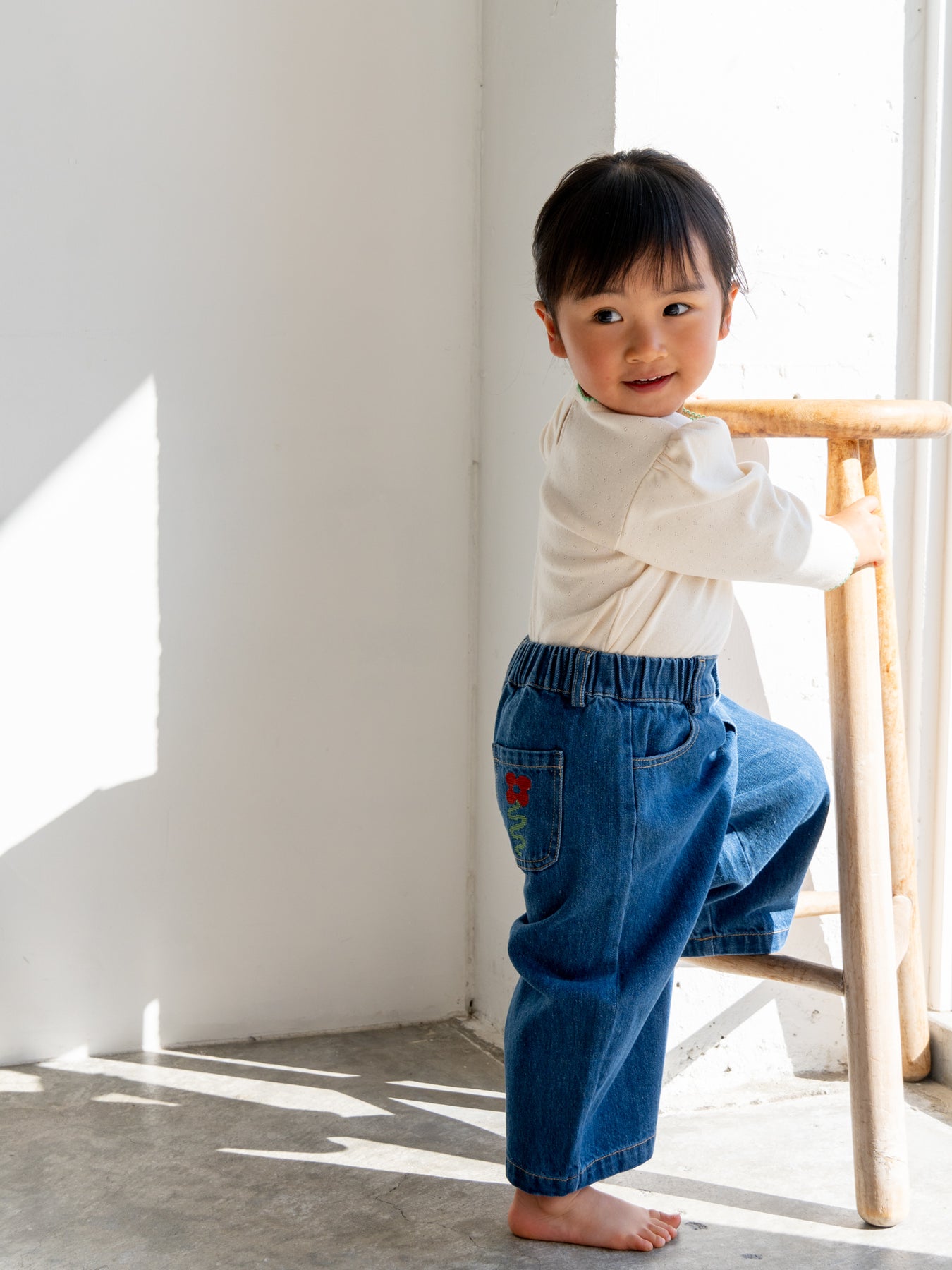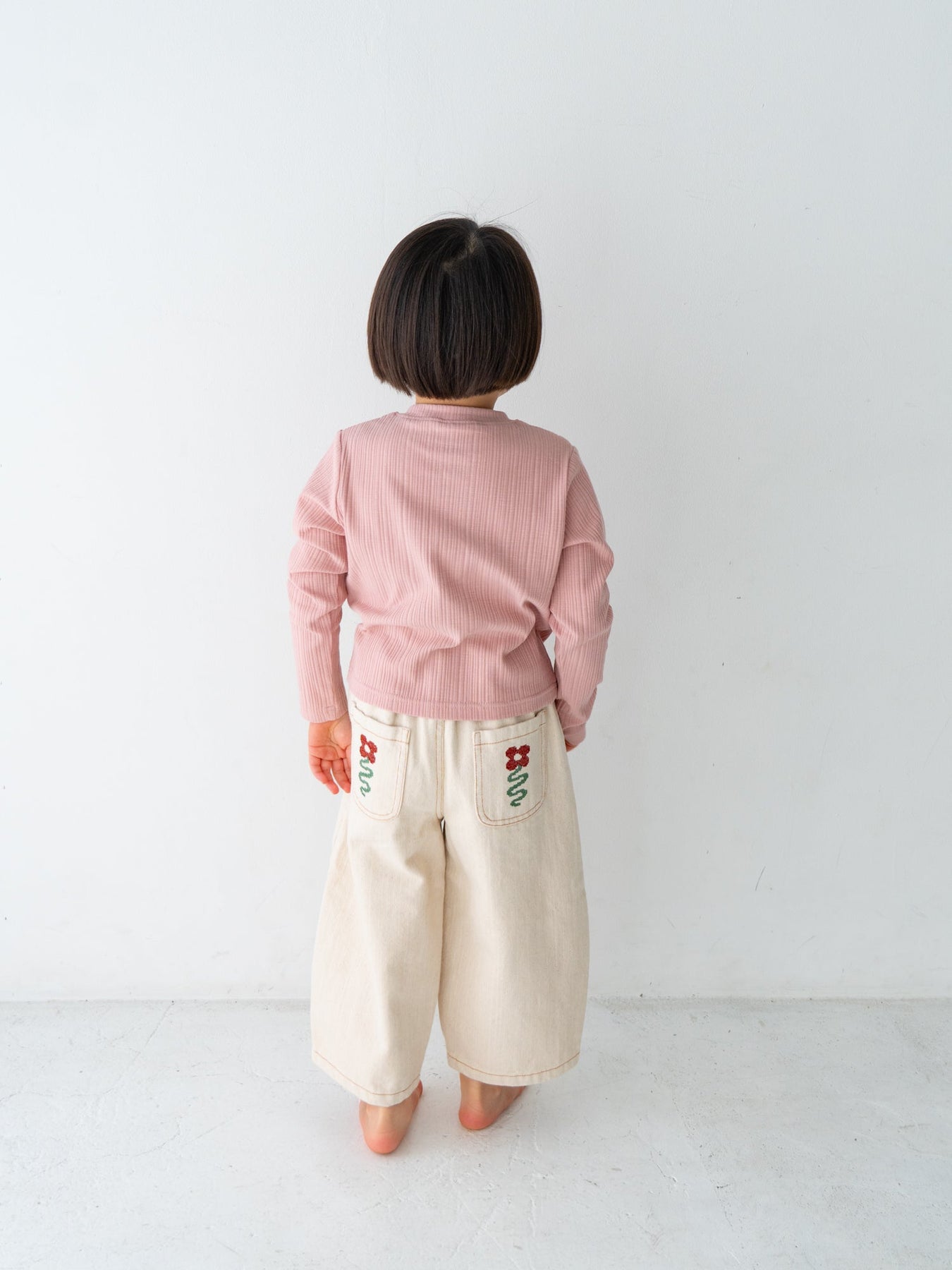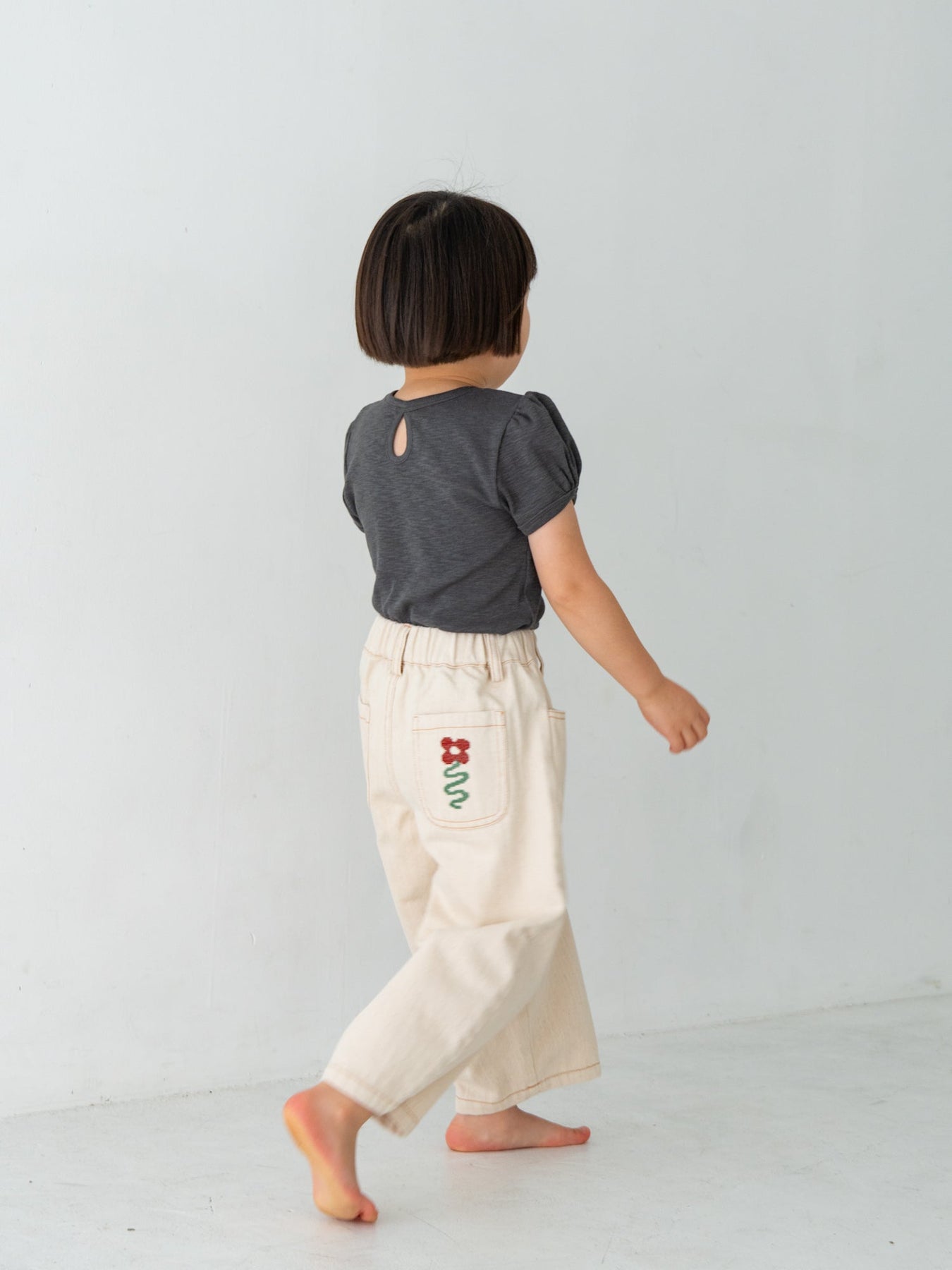 後ろポケットにちょこんと咲いた、クロスステッチのお花がポイント。