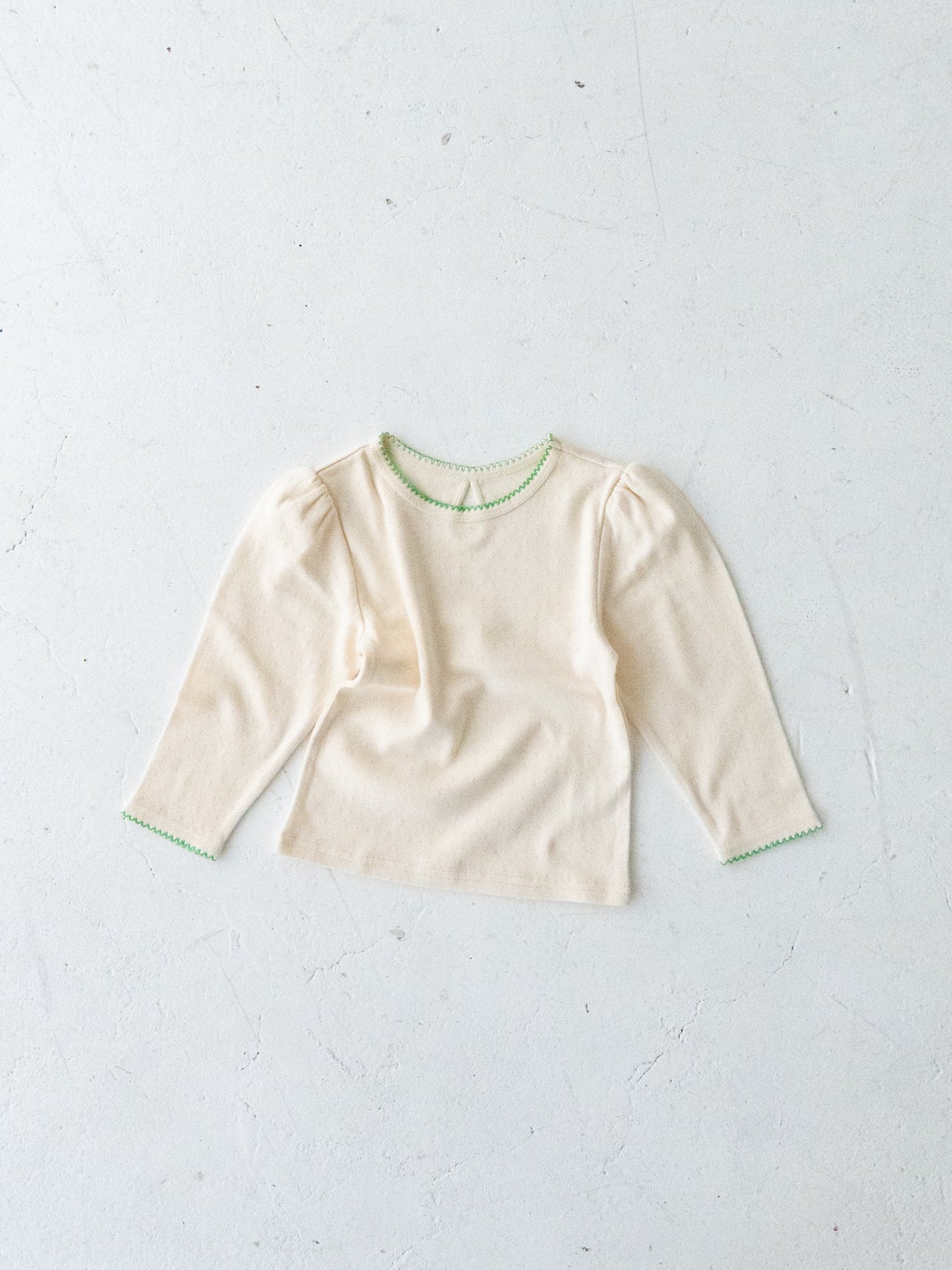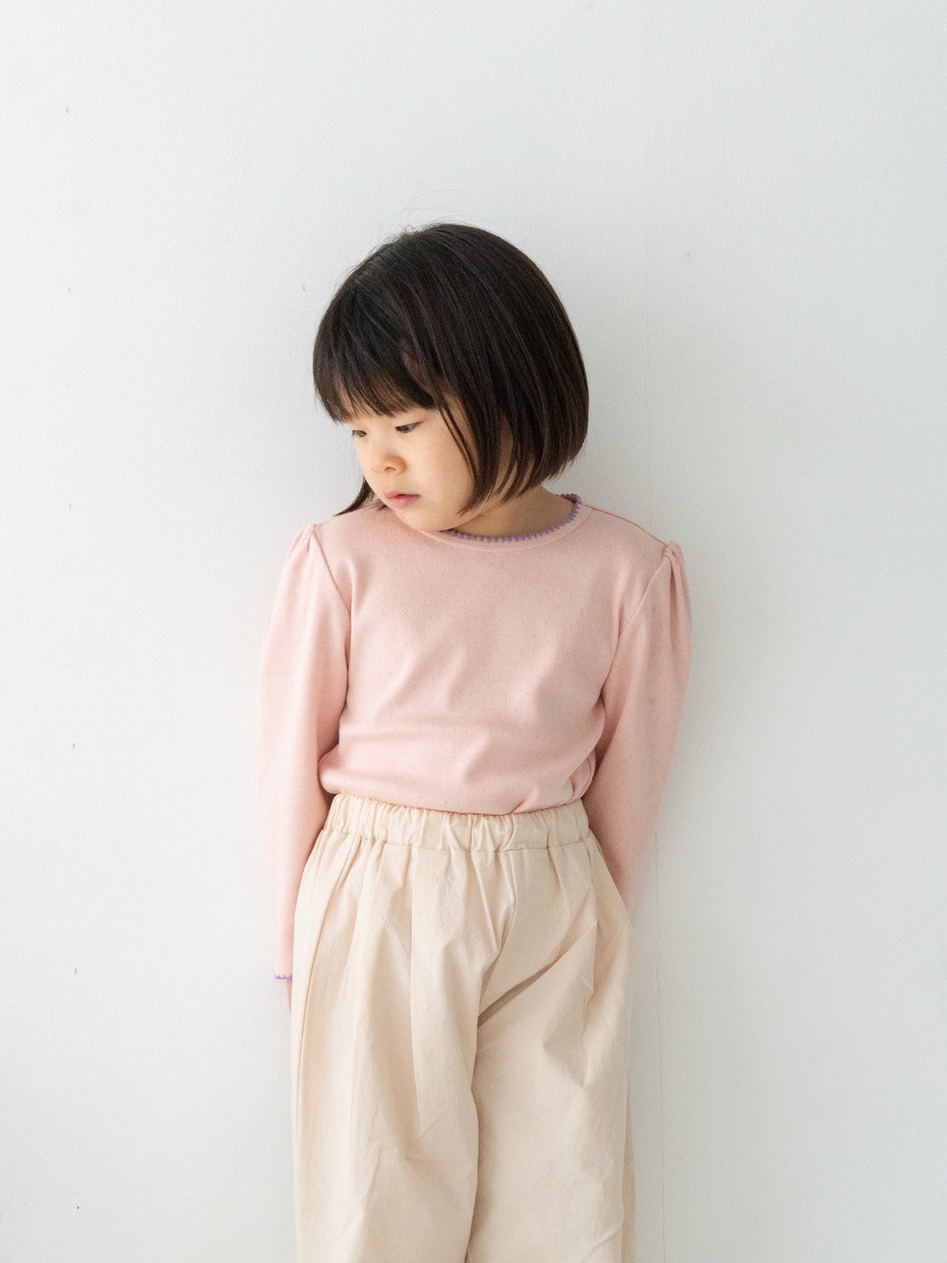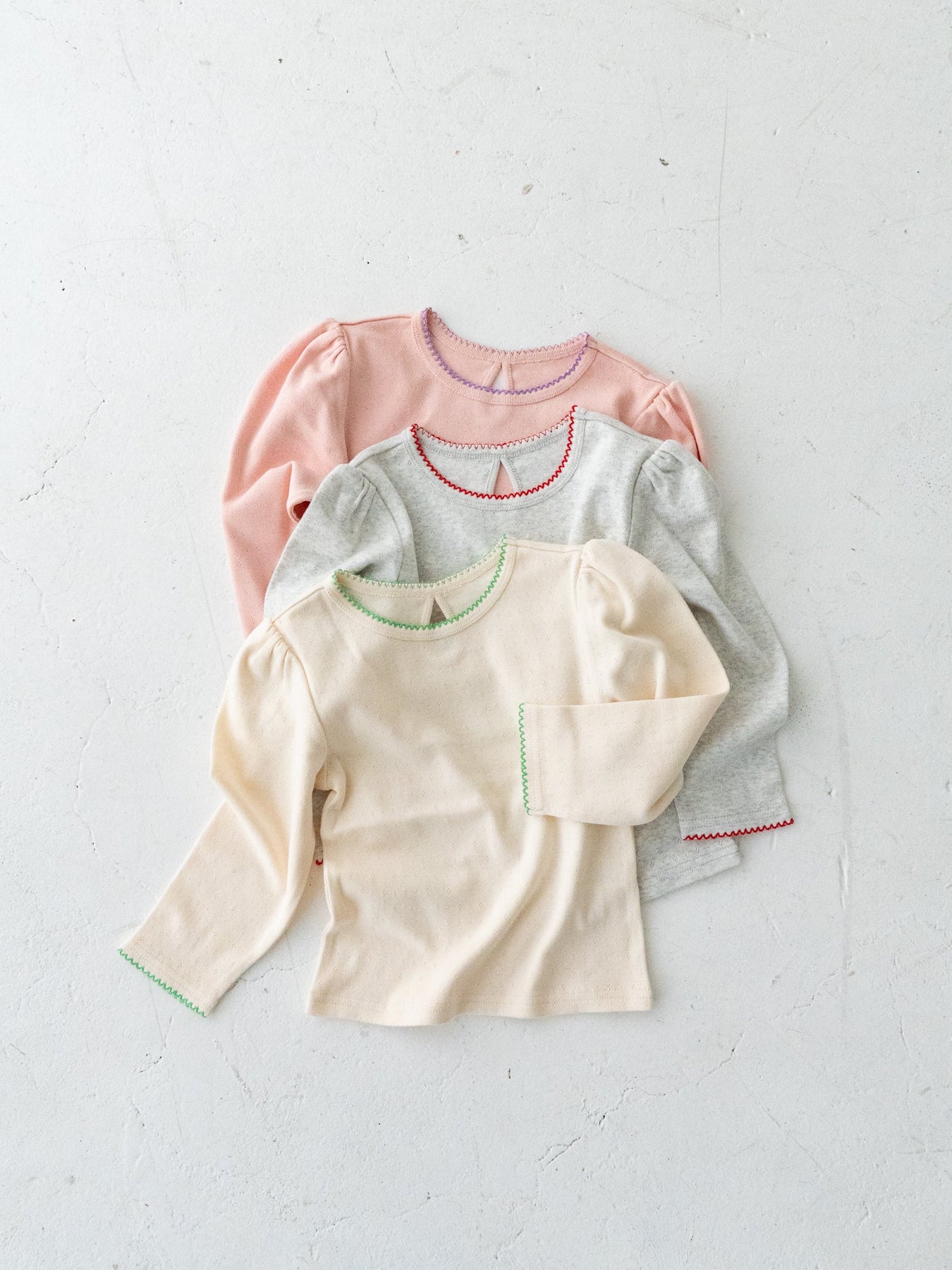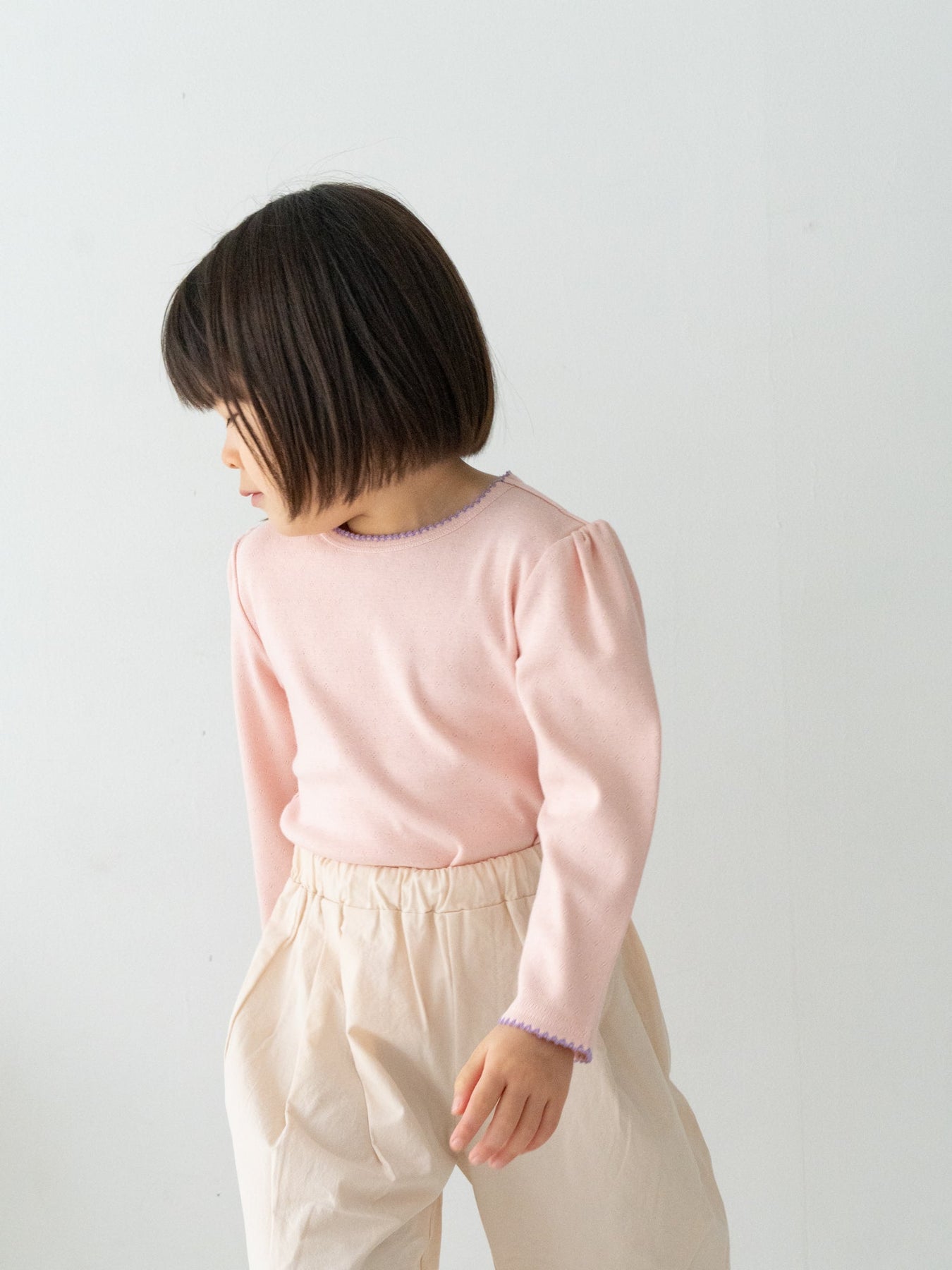 袖口と襟ぐりのかがりステッチが、アクセントとなっています。