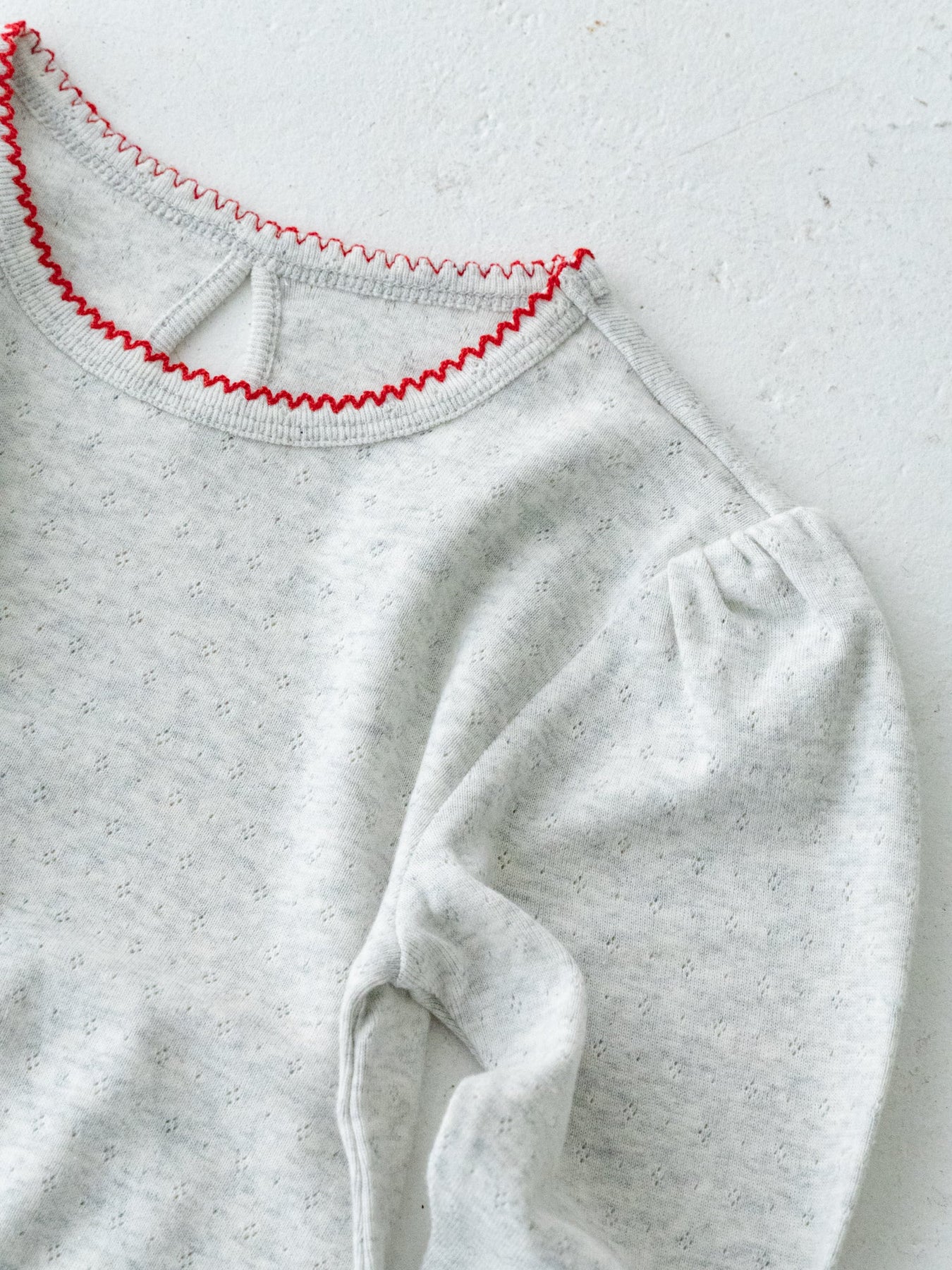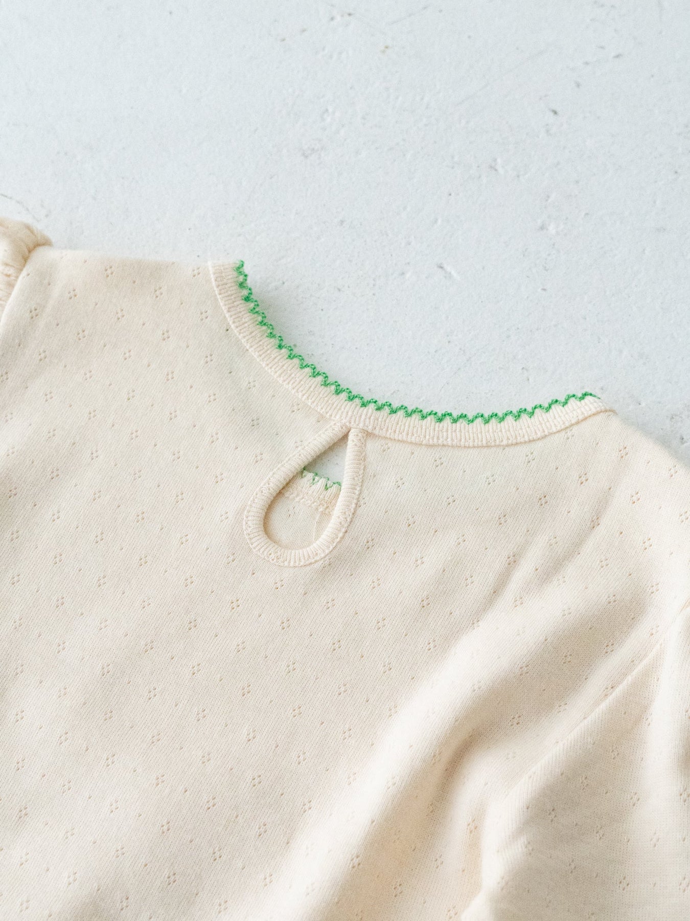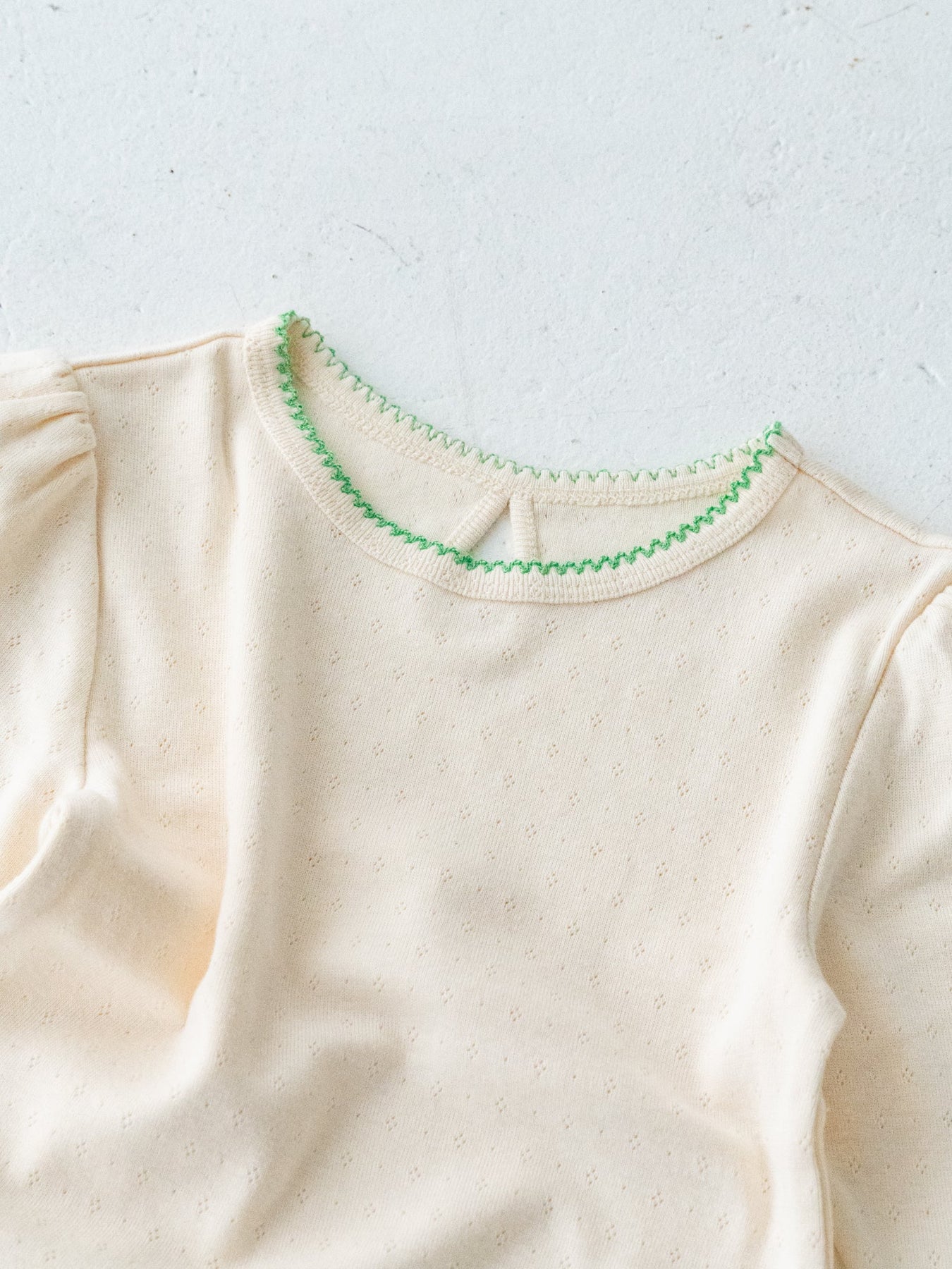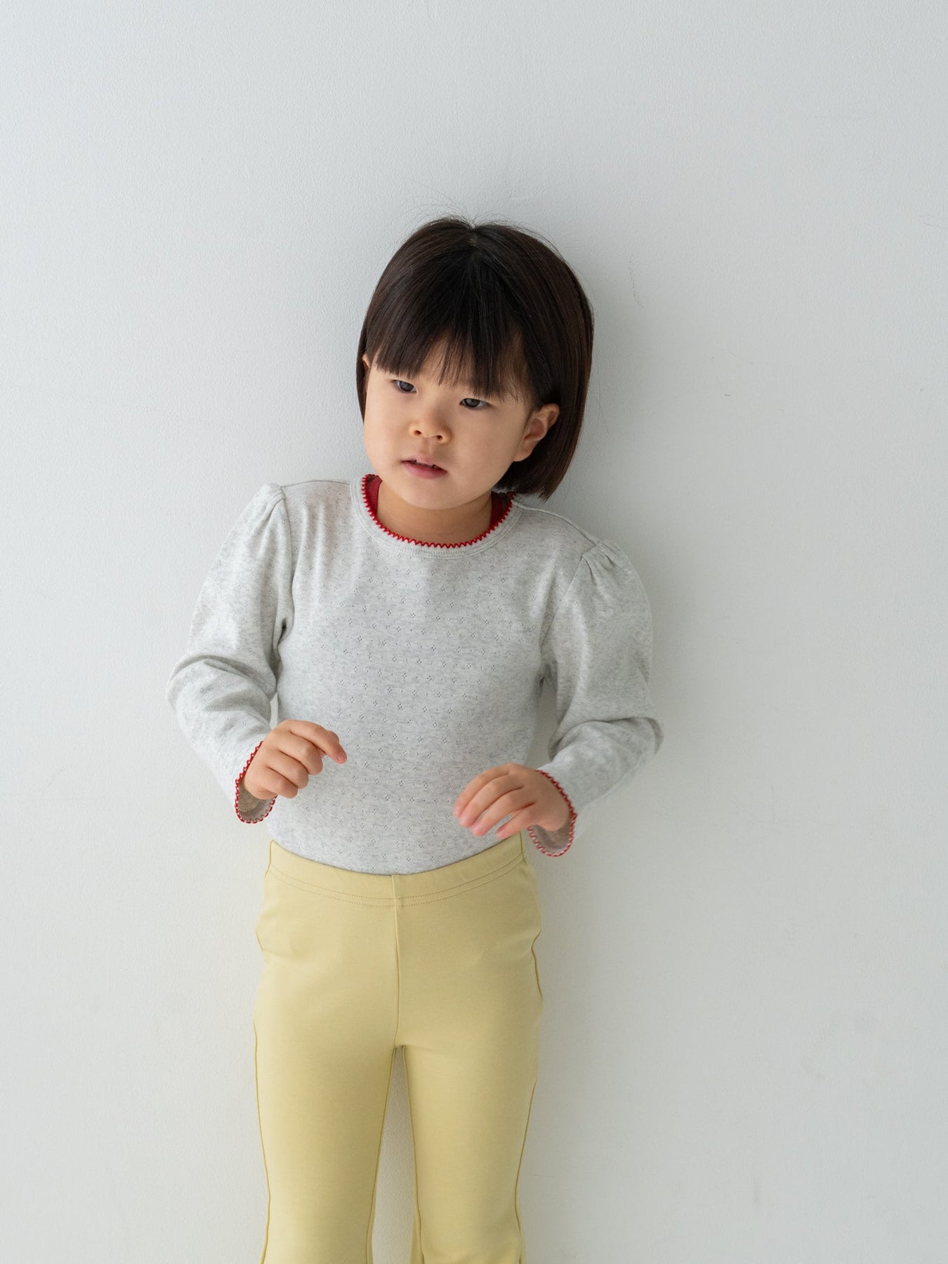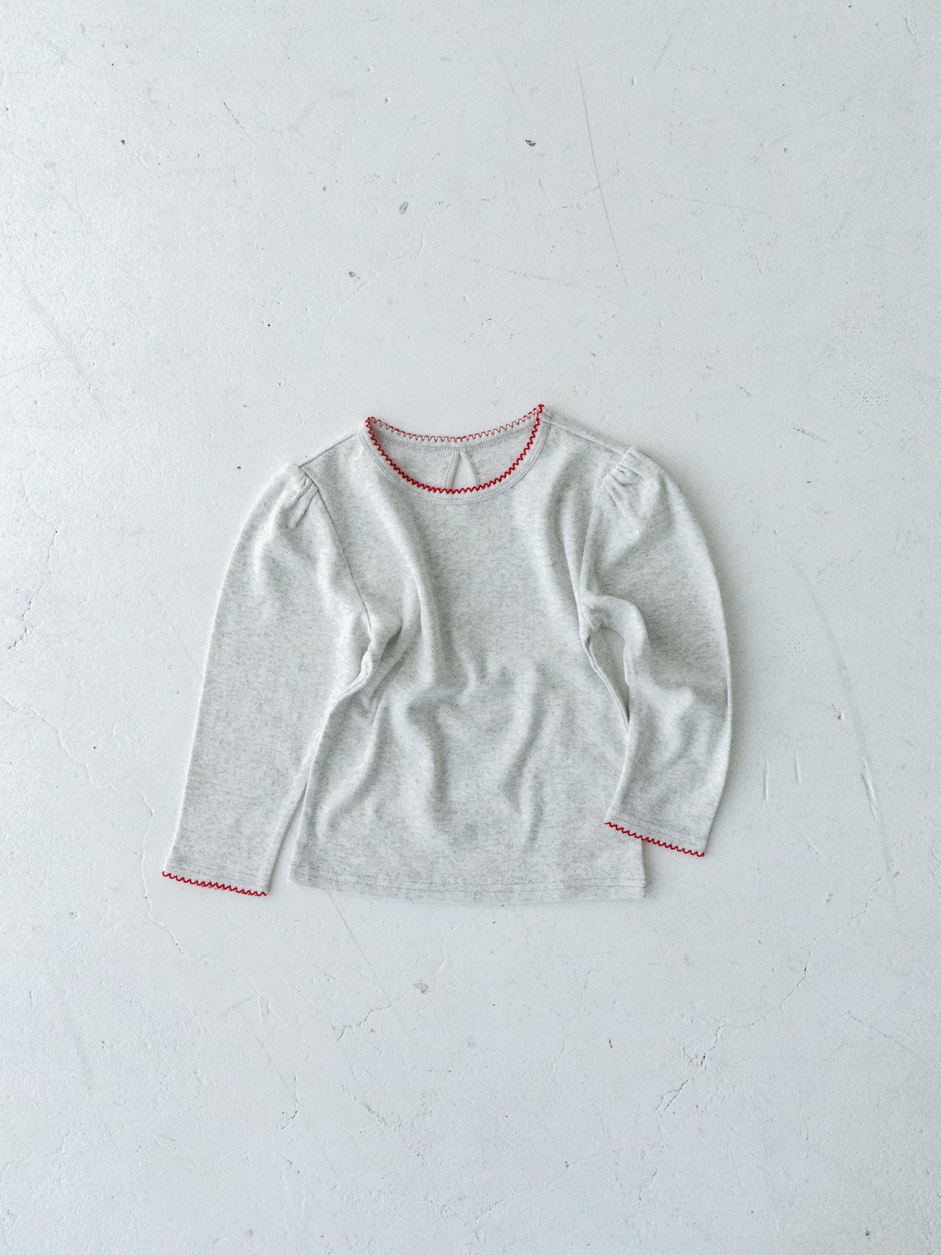 袖口と襟ぐりのかがりステッチが、アクセントとなっています。